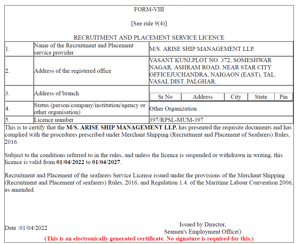 • Arise Ship Management LLP is a RPSL company which specializes in Crew Manning and Placement across the world and handling Seafarer’s flag documents.